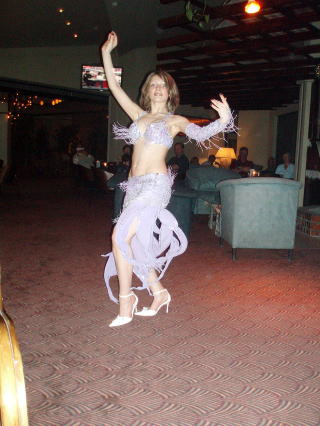 トルコ民族芸能、ベリーダンスのおねーさん。ちょっと足が短い気もしたけど、スタイルは良いしかわいいし、肌は綺麗だし踊りもかなり美しいものでした。いやー、嫁よ。頑張ってくれ。ちなみに僕も嫁もこのあとそれぞれ一緒に踊らされました。まぁ楽しいからいーんだよね。日本人の生き様をとくと見せ、外人さんもバカ受けの素敵なダンスが披露できました。 |