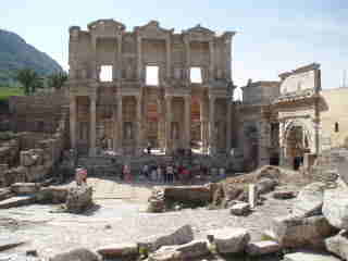 ボロボロだった遺跡をオーストリアの学者達がせっせと復元したローマ時代の図書館。材料の足りない部分はモルタルっぽいやつで補修していました。ちなみにこの図書館の反対側に、古代の風俗店があり、更に図書館から風俗店までの地下の抜け道がありました・・・今も昔も男はそういうのが好きなんですねー。「今日は図書館で勉強してくるから」とか行って女体の神秘(保険体育)を探求していた訳ですね。はっはっは・・・てごめんなさい。 |